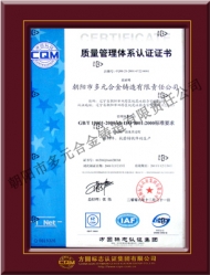 公司于2001年通過IS9001-2000質量管理體系認證,生產的多元牌高錳鋼鑄件于2005年榮獲"遼寧省名牌產品"稱號。